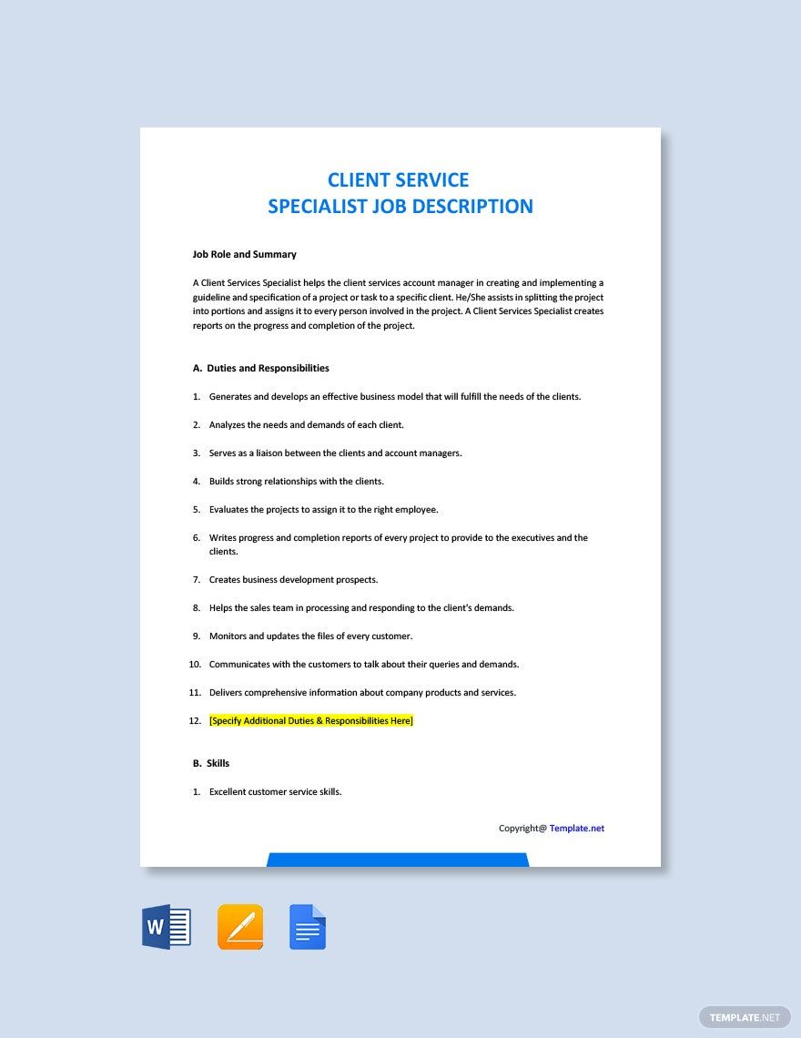 Client Service Specialist Job Ad And Description Template Google Docs Word Apple Pages Template Net